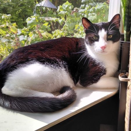 Max has a handsome black and white coat with a pink nose. Max’s human moved and was not able to take Max with her. Interested in helping heal a broken heart? Come meet him today.