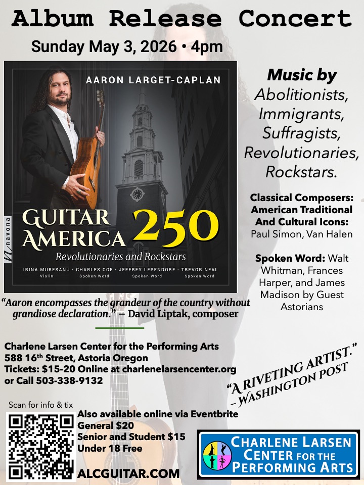 Boston-based guitarist and composer Aaron Larget-Caplan returns to Astoria for a celebratory concert of his twelfth album ‘Guitar America 250 – Revolutionaries and Rockstars’. Featuring music from pre-Civil War through the World Wars, classical composers Irving Berlin and Leonard Bernstein, and cultural icons Paul Simon and Eddie Van Halen, as well as spoken word performed by local Astorians from Astoria High School, reciting poetry by Walt Whitman and Frances Harper. Doors open at 3:30pm. CDs, sheet music, and stickers will be available.