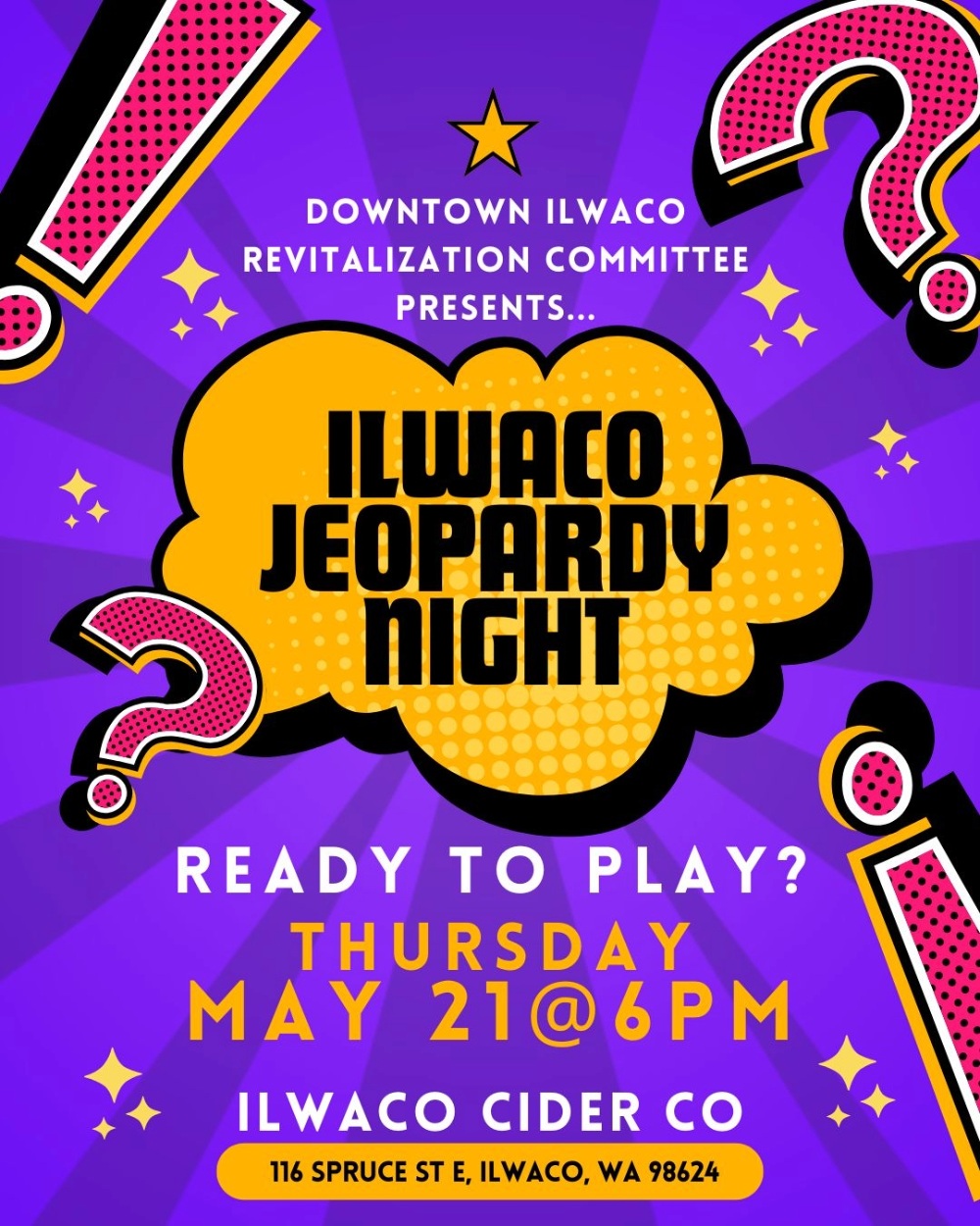 Join us on Thursday, May 21st at 6:00pm for the third annual Ilwaco Jeopardy for fun, facts, and fizzy drinks at Ilwaco Cider Company! Whether you’re a visitor, lifelong local resident, history buff, or just a cider lover, everyone has a shot at trivia glory (and excellent prizes!). Hosted by the Downtown Ilwaco Revitalization Committee, Ilwaco Jeopardy will feature interesting questions about historical facts, current events, hidden gems, and more.