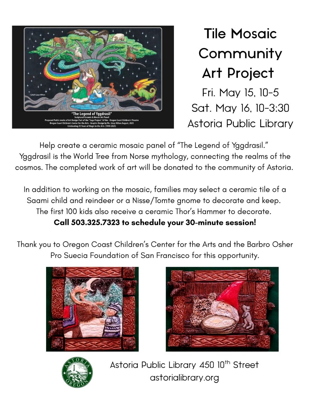 Community art project! Help create a tile mosaic of Yggdrasil, the sacred tree in Norse cosmology. Family Yule tiles and Thor’s hammer are also available to paint and keep. Call 503-325-7323 for information and to sign up for a 30-minute time slot. Friday 10:00am to 5:00pm and Saturday 10:00am to 3:30pm.