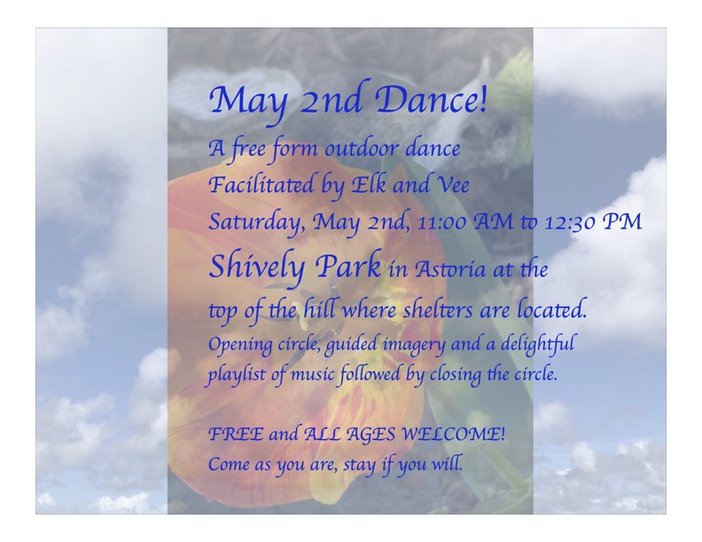 On Saturday, May 2nd we are facilitating an outdoor dance in Shively Park, Astoria from 11:00am until 12:30pm.