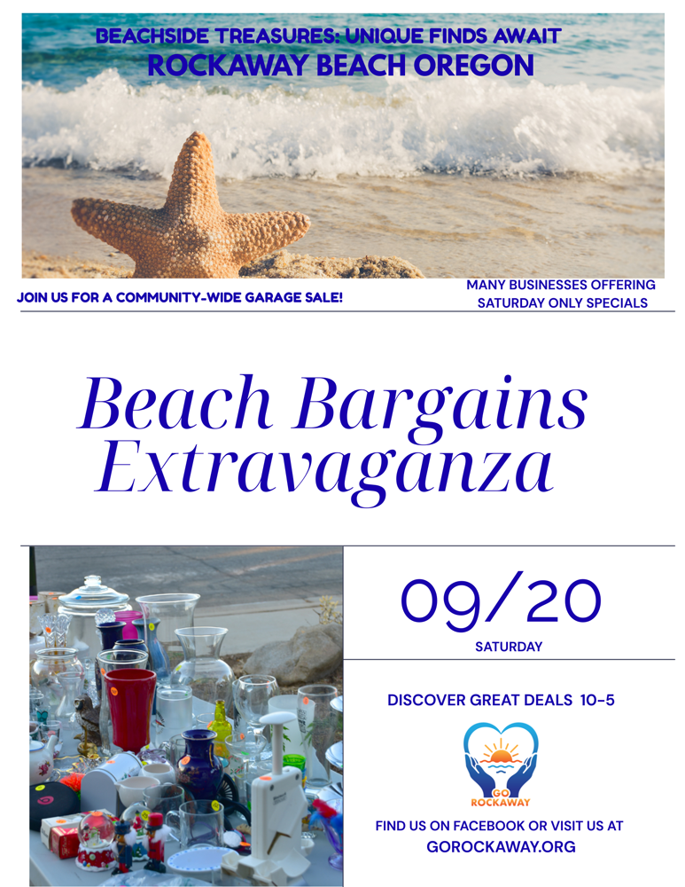 The Rockaway Beach community is hosting our First Annual Beachfront Bargains! A city-wide event! Yard sales all across town and local businesses offering special deals and discounts. A super treasure hunt for everyone. Saturday September 20th Only! As many as 40 homes are participating and 30 businesses offering specials. We will be posting a QR code that highlights a map of the homes and businesses on Friday, September 19th — Just come to Rockaway Beach and look for the Beachfront Bargains signs for participating residents. You can’t miss us!