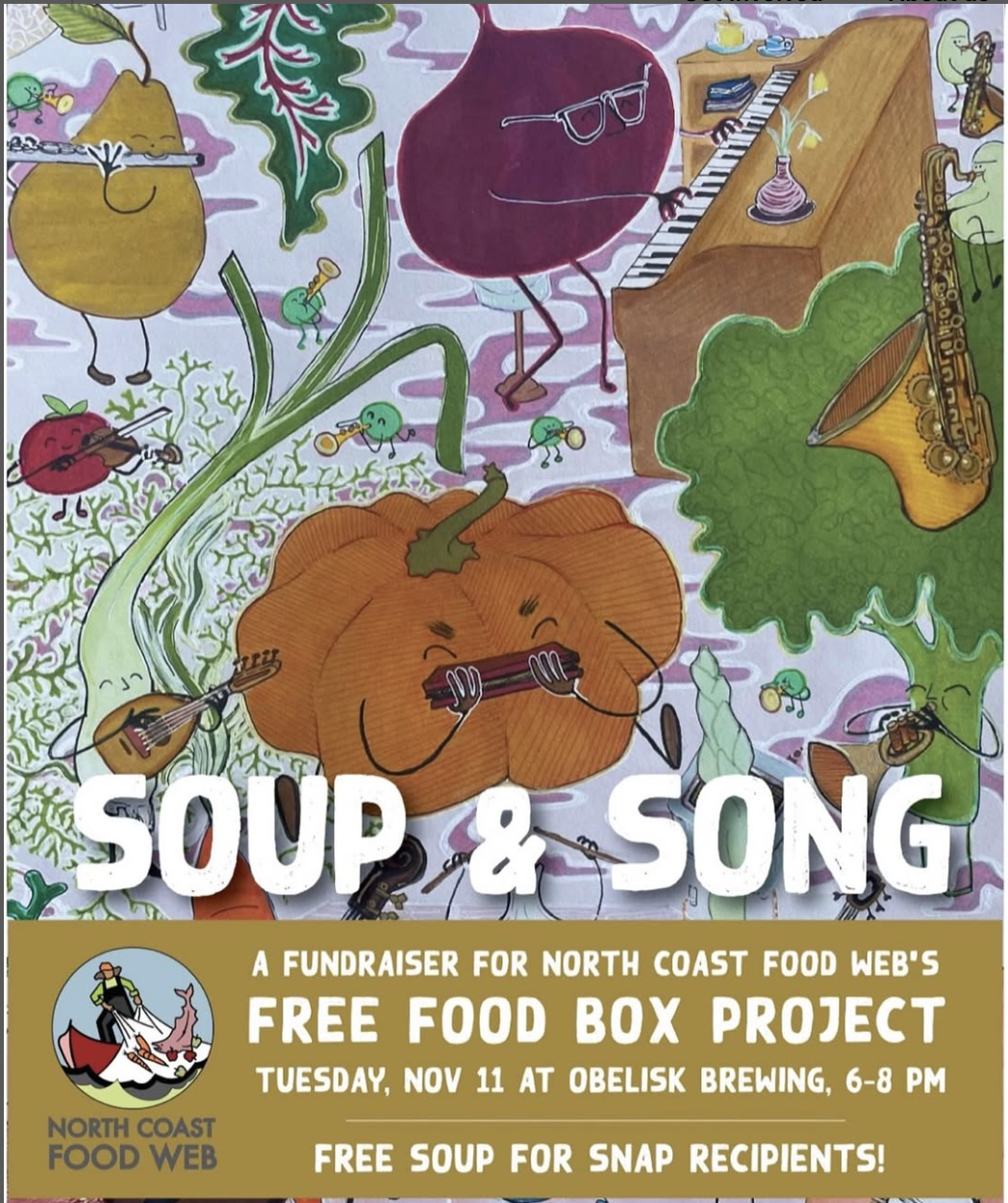 A fundraiser for North Coast Food Web’s Free Food Box project! There will be soup for sale, free soup for SNAP beneficiaries, and food themed acts from local musicians.